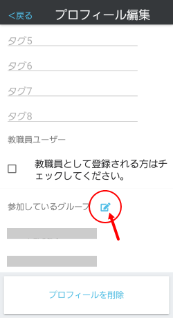 グループ編集は、そのまま画面を下にスクロールすると「参加しているグループ」の横の「編集ボタン」をクリックします。