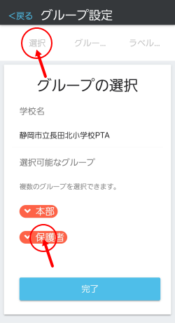 上部左の「選択」をクリックすると選択可能なグループが表示されますので「保護者」をクリック